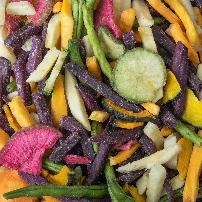 Arroz integral, vegetais desidratados (cenoura, espinafre, tomate, beterraba), sal e óleo vegetal.